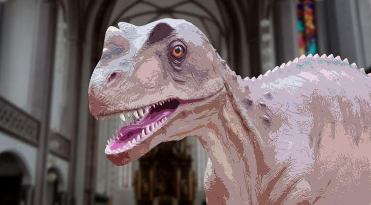 Ein Saurier in der Kirche? Was hat der dort verloren? Eine Geschmacklosigkeit? Ein Protest? Gegen was?