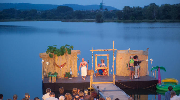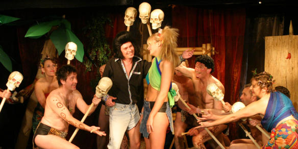 Szenenbild aus “Häuptling Abendwind”, Wiederaufnahme 2006Mitwirkung: Text, Regie, DarstellerWer sich auf Nestroys anarchischen Humor einlässt, wird viel Spaß an dem ziemlich unbekannten Stück haben. Unsere “Wilden” sprechen natürlich Fränkisch statt im Wiener Dialekt. Aber das funktioniert ebenfalls hervorragend. Die musikalischen Ideen brummelte ich in ein Diktiergerät. Thomas Schimmel machte daraus wirkliche Musik. Sie wurde mit etwas unkonventionellen Instrumenten (z.B. Knochen auf Schädeln) begleitet und wurde zu Ohrwürmern.Molière ist ein Theater-Praktiker mit einem exzellenten Gespür für effektvolle Auftritte, Charaktere und Timing. Die Dialoge, bei denen die Partner aus unterschiedlicher Perspektive das vermeintlich gleiche Thema behandeln, sind ein Leckerbissen. Darum werden die Stücke des Franzosen auch nach fast 400 Jahren auf den Bühnen der Welt rauf und runter gespielt. Zahllose Autoren haben sich auf seine Texte gestürzt, um sie in ihrem Stil umzuarbeiten. Ich bin schon wieder einer davon.