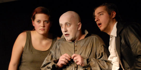 Szenenbild aus “Der Geizich”, 2008Mitwirkung: Text, Regie, DarstellerDie Figuren in der Vorlage des Meisters sind so stark gezeichnet, dass sie nichts als einen leeren, schwarzen Raum brauchen, um das Publikum zu beeindrucken - vor allem, wenn man einen Frank “Frecko” Schott für die Rolle des Harpagon hat.Natürlich bin ich längst kein Molière, aber ein bisschen stolz bin ich auf eine kleine Szene, die ich dem Meister in meiner Fassung untergejubelt habe und durchaus von ihm sein könnte.Kleist ist auch so einer, der es einem nicht leicht macht, die Finger von ihm zu lassen. Der “Zerbrochne Krug” ist ein grandioses Stück, aber in der Original-Fassung von Amateur-Darstellern schwer spielbar. Ich habe eine Version erstellt, in der die fränkische Sprache zu manchen Rollen passt und die Schauspieler nicht an ein Versmaß gebunden sind.